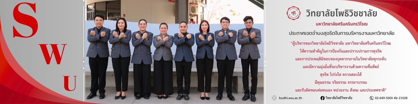 ผู้ช่วยศาสตราจารย์ ดร.อารมย์ จันทะสอน คณบดีวิทยาลัยโพธิวิชชาลัย Dean, Bodhivijjalaya College Assistant Professor Dr.Arom Jantasorn Tel:02-649-5000 ext. 27395 aromj@g.swu.ac.th